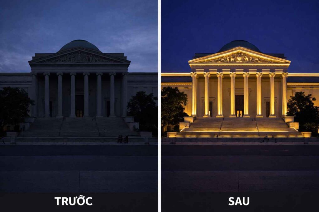 [Hình ảnh: So sánh “Trước & Sau” đèn led mặt tiền bảo tàng]